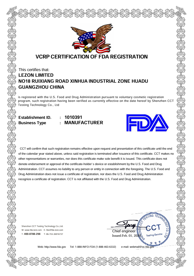 Leezon is an FDA-registered cosmetic manufacturer that complies with cGMP, ensuring the production of safe, effective, and consistent products.